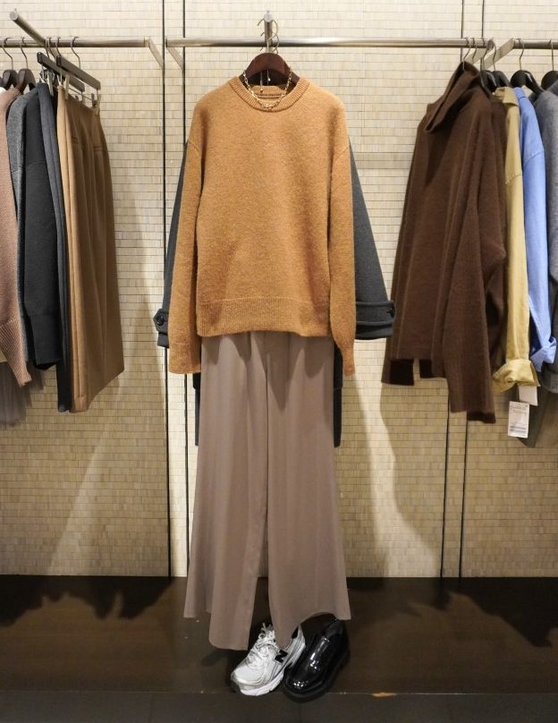 テロンとしたスカートにモヘアのニットを合わせた異素材MIXコーデ。