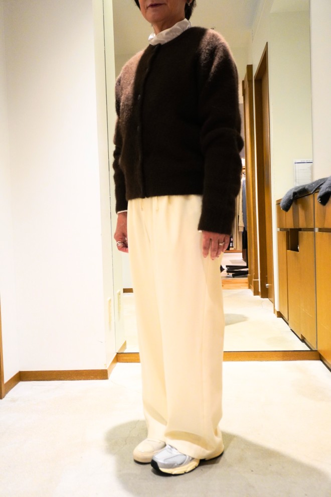 白のパンツにモヘアのカーディガン、白のブラウスのフリルを首元からのぞかせたコーディネート。