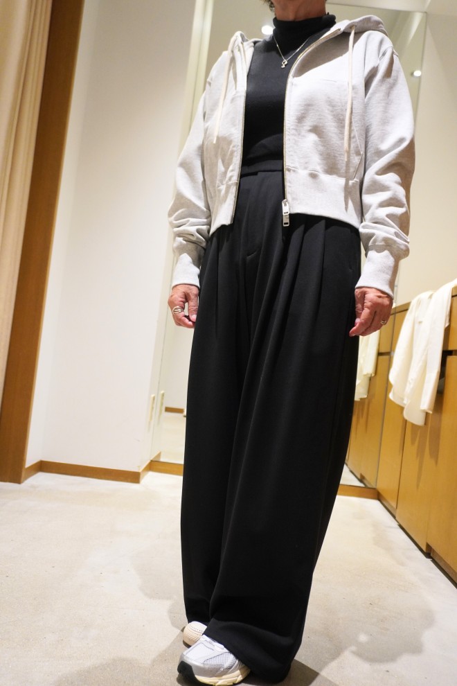 黒のタックパンツに短め丈のパーカーを合わせたコーディネート。