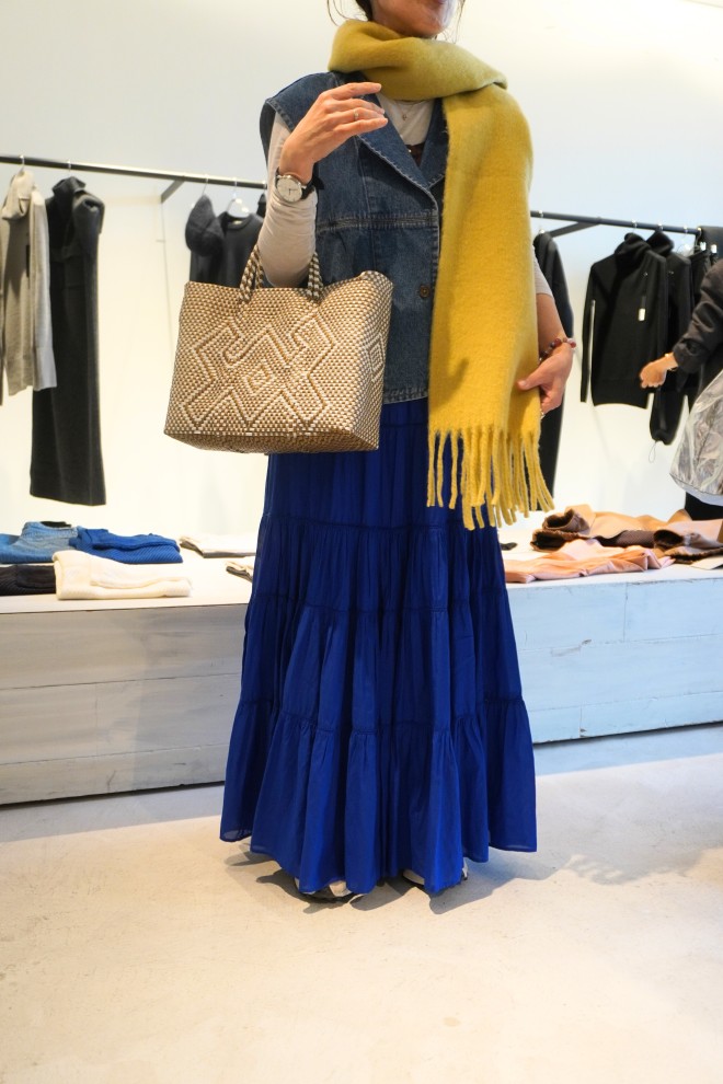 綺麗なトマト赤のマフラーとニュアンスのある黄色のマフラーを巻いてみることに。