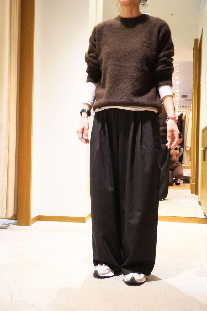 今年流行の茶色のモヘアのニットをコーディネート。