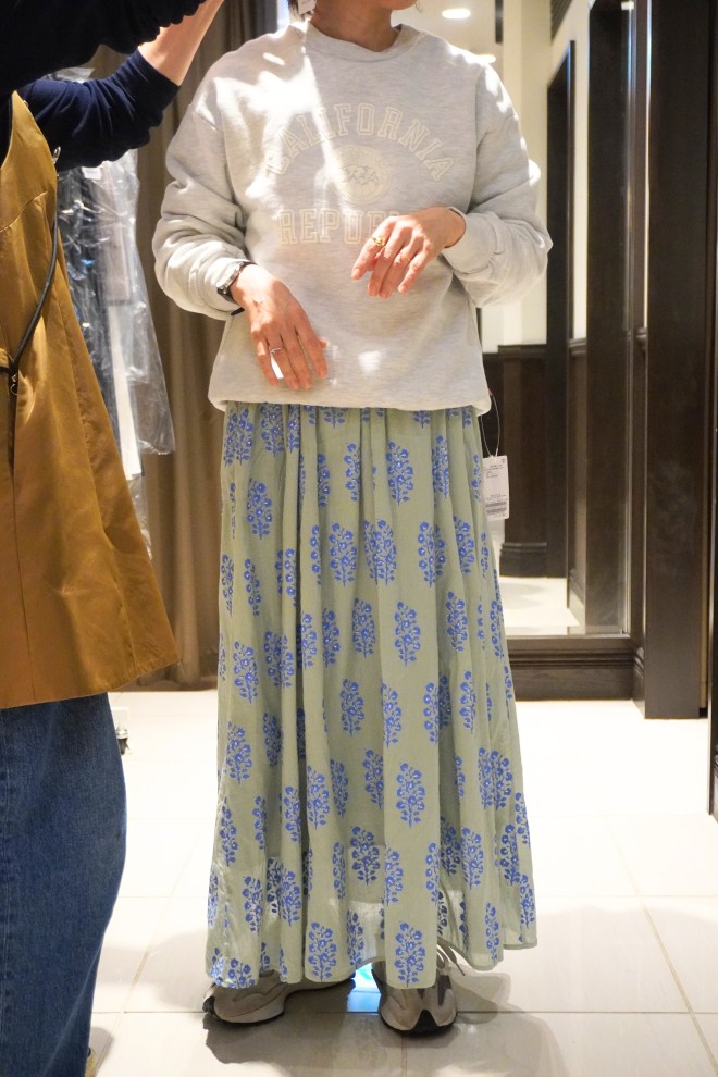 アジアンテイストのワンピースにロゴの主張が控えめのスウェットを合わせ、