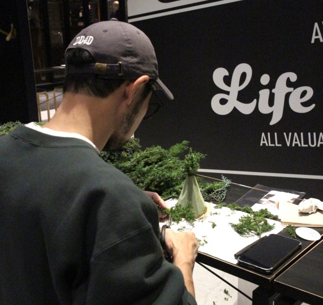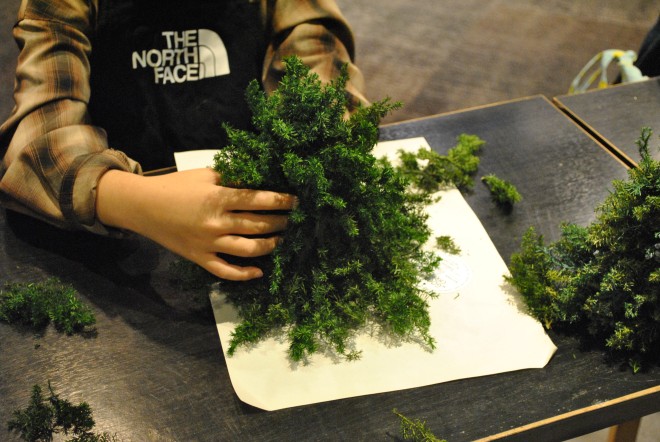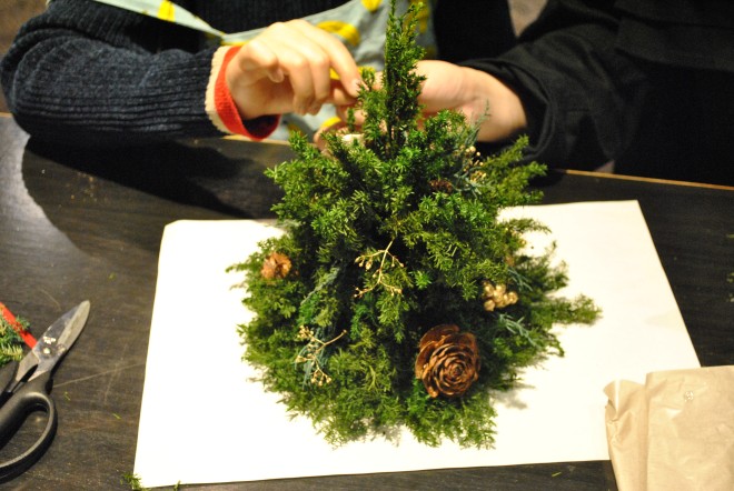 土台に針葉樹の小枝を差し込み、ボリュームたっぷりのツリーを作っていきます。
